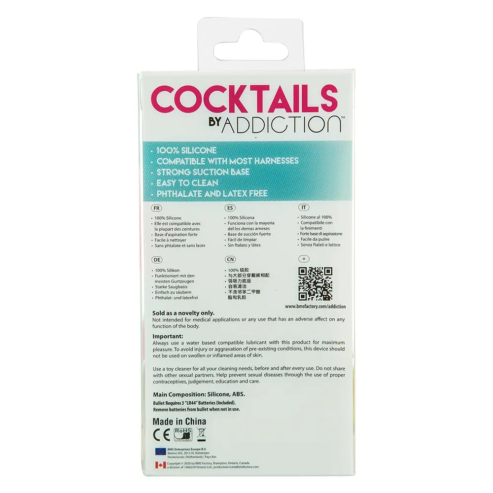 Zagrevamo atmosferu koktelima, najnovijom i najukusnijom tropskom poslasticom ADDITION-a! Uronite u ostrvske vibracije dok uživate u potpuno novom iskustvu užitka uz naš vertikalni dong od mente Mojito. COCKTAILS by Addiction je 100% silikon, kao i bez ftalata i lateksa, što ga čini super lakim za čišćenje.